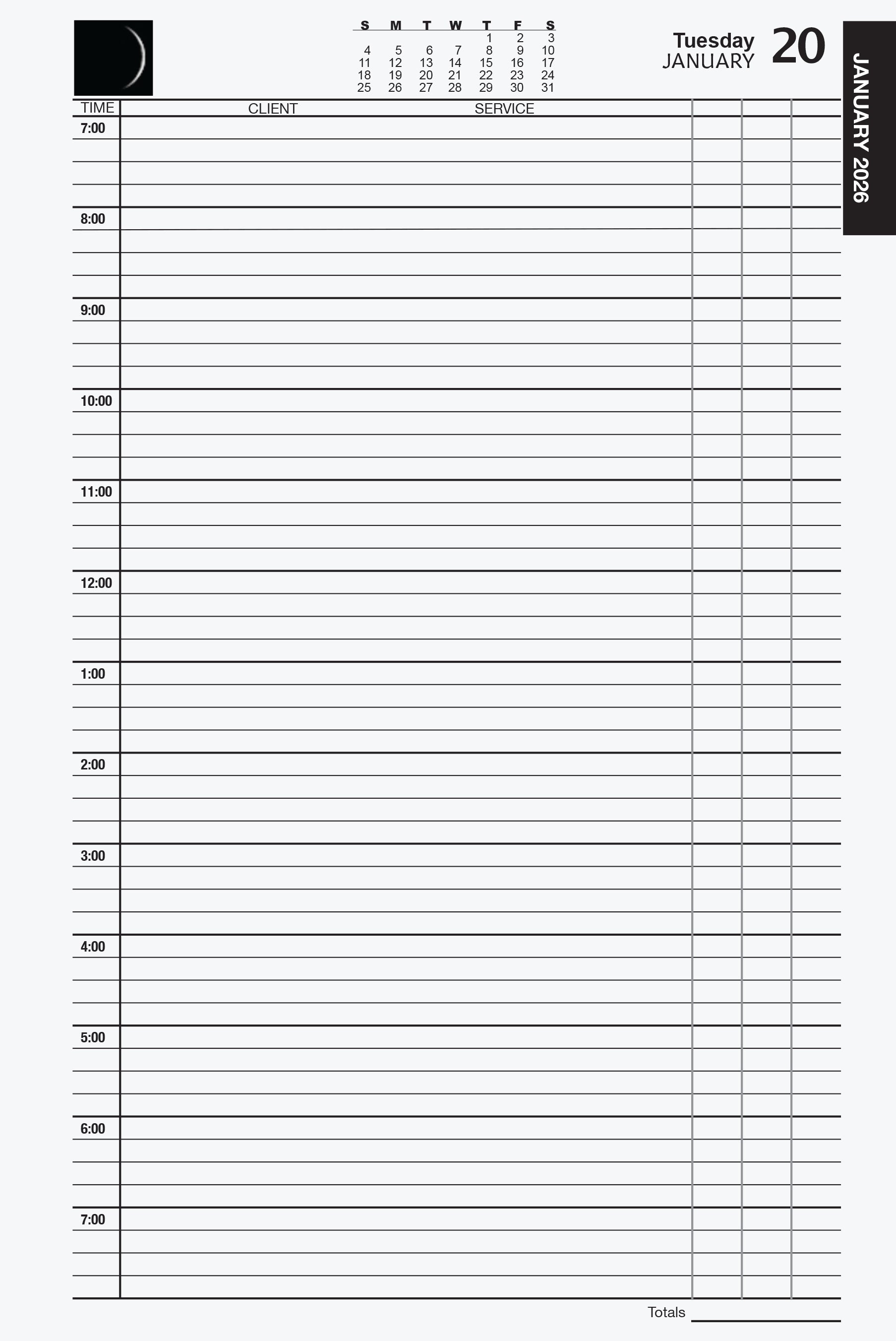 A 442 page Spiral bounded book that is 8 1/2" X 11". Covers are laminated with a clear vinyl that makes the book durable lasting the whole year. This is a perfect source for anyone that has to keep a daily record for their services and needs more room to write. Each day of the year, including weekends, has its own page with ruled lines from 7:00 AM to 7:00 PM in 15 minute increments. Each day's header has the day, date and month. It also has a monthly calendar and daily moon phase. The back of the book has weight and measurement conversion charts with car mileage and vehicle service record charts. There is also a page of current years and the next years' holidays. This book is used by anyone needing to keep track of the time they spend on billable hours. Lab technicians, dog groomers, truck drivers, graphic artists, beauticians and veterinarians have used this book for the past 30 years.
